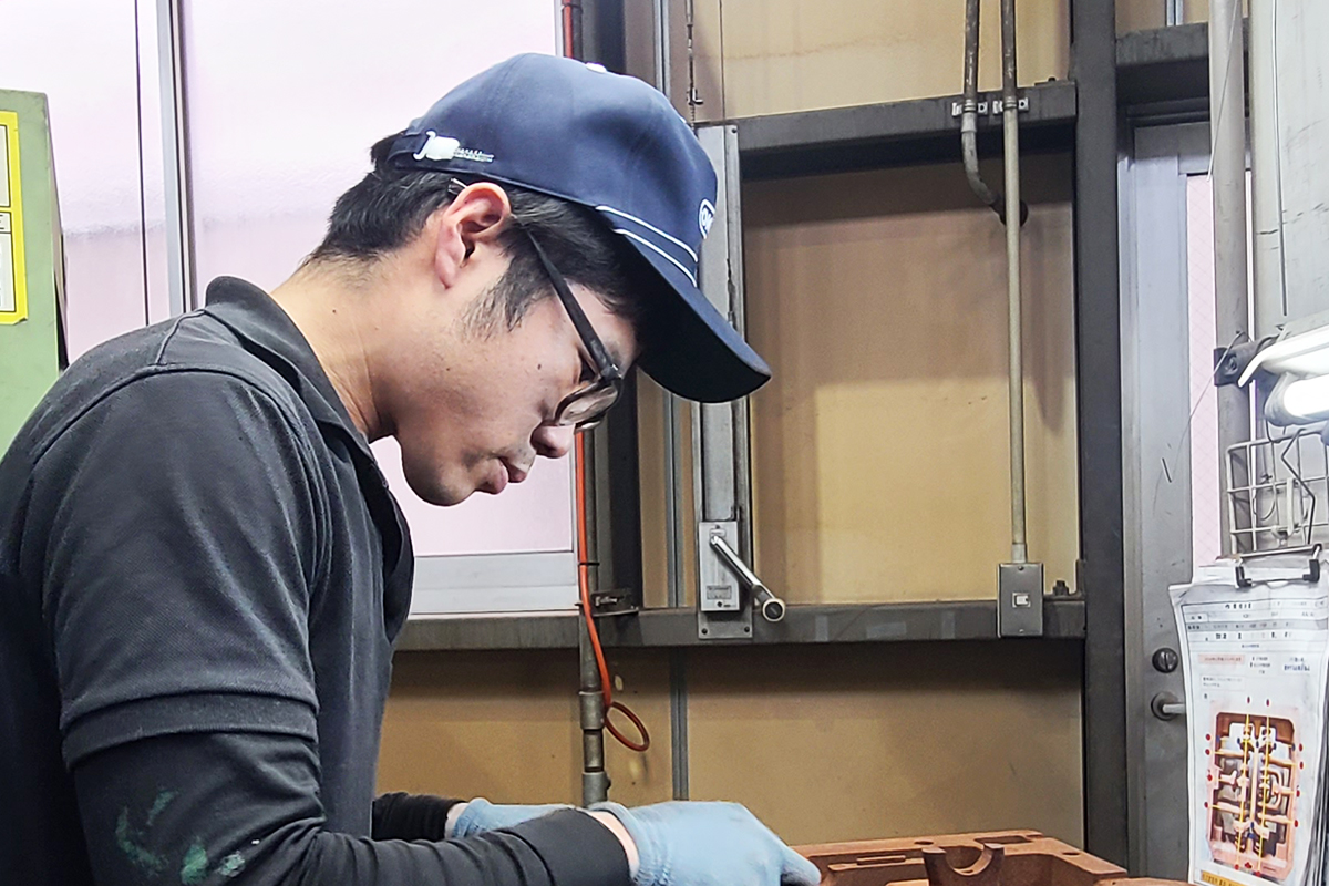 会社に入ったばかりの頃は、砂型がなんなのかすら全然わかりませんでした。砂型の形を作るんですけど、砂を吹き込む時の圧だったり、火の温度調整、砂の量の調整なんかがすごく難しかったです。でも、すこしずつ技術を学んでいって...たとえば、砂を吹き込む時に「シューッ」という音がするんですけど、音が高かったら砂が少ないなとか、鈍かったら多いなっていう感覚を音で聞き分けれるようになって。やっぱり上手に作れるとすごく嬉しいですし、順序よく仕事を進められることにやりがいを感じるようになりました。